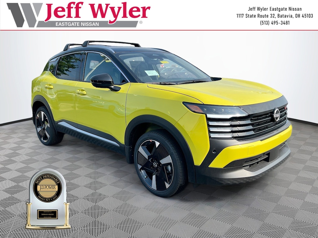 Yuzu Yellow Metallic/Super Black 2025 Nissan Kicks SR 2.0L DOHC FWD CVT with Xtronic 28/35 City/Highway MPG Jeff Wyler Eastgate Auto Mall is delighted to offer this wonderful 2025 Nissan Kicks SR in Yuzu Yellow Metallic/Super Black. Well equipped with: 17" Alloy Wheels, 19" Alloy Wheels, 2-Tone Premium Paint, 4-Wheel Disc Brakes, 6 Speakers, ABS brakes, Air Conditioning, Alloy wheels, AM/FM radio: Sirius, Auto High-beam Headlights, Automatic temperature control, Brake assist, Bumpers: body-color, Carpeted Floor Mats & Underfloor Protector, Crossbars, Delay-off headlights, Driver door bin, Driver vanity mirror, Dual front impact airbags, Dual front side impact airbags, Electronic Stability Control, Front anti-roll bar, Front Bucket Seats, Front Center Armrest, Front reading lights, Front wheel independent suspension, Fully automatic headlights, Illuminated entry, Knee airbag, Leather Shift Knob, Leather steering wheel, Low tire pressure warning, Occupant sensing airbag, Outside temperature display, Overhead airbag, Overhead console, Panic alarm, Passenger door bin, Passenger vanity mirror, Power door mirrors, Power steering, Power windows, Radio data system, Radio: AM/FM Audio System, Rear anti-roll bar, Rear reading lights, Rear seat center armrest, Rear side impact airbag, Rear window defroster, Rear window wiper, Remote keyless entry, Security system, Speed control, Speed-sensing steering, Splash Guards, Split folding rear seat, Spoiler, Sport Cloth/Leatherette Seat Trim, Sport steering wheel, Steering wheel mounted audio controls, Tachometer, Telescoping steering wheel, Tilt steering wheel, Traction control, Trip computer, Turn signal indicator mirrors, Variably intermittent wipers, and Wireless Apple CarPlay/Wireless Android Auto. 28/35 City/Highway MPG Price includes: $1000 - Nissan MY25 New Kicks (SV and SR) Retail/Lease Bonus Cash. Exp. 01/05/2026 $500 - Nissan MWR MY25 New Kicks Bonus Cash - December. Exp. 01/05/2026