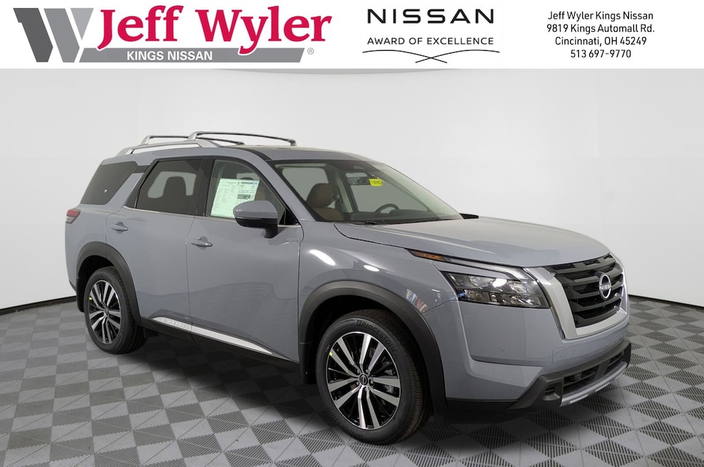 Jeff Wyler Kings Nissan is proud to offer this stunning 2025 Nissan Pathfinder Platinum in Boulder Gray Pearl. Well equipped with: Cargo Package (Cargo Area Protector, Cargo Net, and First Aid), 4WD, 13 Speakers, 3rd row seats: bench, 4-Wheel Disc Brakes, ABS brakes, Air Conditioning, Alloy wheels, AM/FM radio: SiriusXM, Auto High-beam Headlights, Auto tilt-away steering wheel, Auto-dimming Rear-View mirror, Automatic temperature control, Bench Seat Carpeted Floor Mats (Set of 4), Black Splash Guards (Set of 4), Bodyside moldings, Bose Premium Audio System, Brake assist, Bumpers: body-color, Climate Controlled Front Bucket Seats, Cross Bars, Delay-off headlights, Driver door bin, Driver vanity mirror, Dual front impact airbags, Dual front side impact airbags, Electronic Stability Control, Emergency communication system, Exterior Parking Camera Rear, Four wheel independent suspension, Front anti-roll bar, Front Bucket Seats, Front Center Armrest, Front dual zone A/C, Front reading lights, Fully automatic headlights, Garage door transmitter: HomeLink, Heads-Up Display, Heated door mirrors, Heated front seats, Heated rear seats, Heated steering wheel, Illuminated entry, Knee airbag, Leather steering wheel, Low tire pressure warning, Memory seat, Navigation system: NissanConnect with Navigation and Services, Nissan USB Charging Cable Set, NissanConnect featuring Apple CarPlay and Android Auto, NissanConnect w/Navigation & Services, Occupant sensing airbag, Outside temperature display, Overhead airbag, Overhead console, Panic alarm, Passenger door bin, Passenger vanity mirror, Power door mirrors, Power driver seat, Power Liftgate, Power moonroof, Power passenger seat, Power steering, Power windows, Premium Paint, Radio data system, Radio: AM/FM Audio System, Rain sensing wipers, Rear air conditioning, Rear anti-roll bar, Rear reading lights, Rear seat center armrest, Rear side impact airbag, Rear window defroster, Rear window wiper, Reclining 3rd row seat, Remote keyless entry, Security system, Semi-Aniline Leather-Appointed Seating Surfaces, Speed control, Speed-sensing steering, Speed-Sensitive Wipers, Split folding rear seat, Spoiler, Steering wheel memory, Steering wheel mounted audio controls, Tachometer, Telescoping steering wheel, Tilt steering wheel, Traction control, Trip computer, Turn signal indicator mirrors, Variably intermittent wipers, Ventilated front seats, and Wheels: 20" x 8J Machined Alloy.Wyler Family First Package Includes: NanoCure Appearance Protection: Exterior & Interior Chemical Sealant Applied to Protect Against Environmental Hazards (7 Year Warranty Coverage). Pulse- Rear end Collision Avoidance System Theft Deterrent Strategy gives you 5 Years of Coverage against vehicle Theft, Offering up to a $5,000 benefit. Used vehicles 10 years of age or newer with less than 100,000 miles are eligible for the Wyler Assurance Program, but eligible vehicles must pass our reconditioning process and multi-point inspection. Provided the vehicle passes inspection, vehicles will be eligible for the 6 month/6,000 mile limited warranty. The 6 month/6,000 mile limited warranty is NOT available on AS-IS vehicles, wholesale vehicles, lease buyback/pass-thru vehicles or un-inspected vehicles. Note that this program can also apply to vehicles where the remaining factory coverage is less than 6 months or 6,000 miles. Please check the Federal Trade Commission (FTC) Buyers guide on the vehicle for full details as to whether or not warranty coverage may apply. Contact Dealer for additional details. The Wyler Assurance 6 month/6,000 Mile limited warranty ends 6 months from the date of the Retail Purchase Agreement (BUYERS ORDER) or when the vehicle's odometer registers 6,000 additional miles to the mileage listed on the BUYERS ORDER, whichever comes first. Your Deductible - The warranty holder on your cont Price includes: $1000 - Nissan Select VIN Retail Bonus Cash. Exp. 11/03/2025 $5000 - Nissan Customer Cash. Exp. 11/03/2025