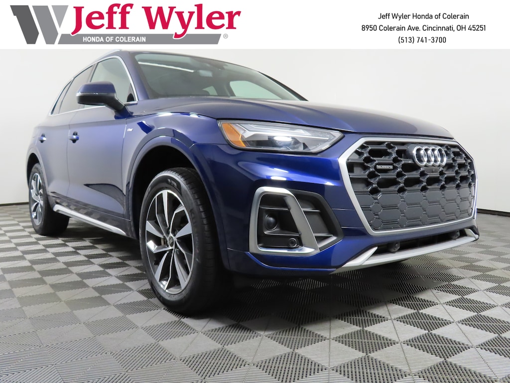 Jeff Wyler Honda of Colerain is pleased to offer this attractive 2022 Audi Q5 45 S line Premium Plus in Blue Metallic. Well equipped with: ABS brakes, Alloy wheels, Compass, Electronic Stability Control, Front dual zone A/C, Heated door mirrors, Heated front seats, Illuminated entry, Low tire pressure warning, Power Liftgate, Remote keyless entry, Traction control, 10 Speakers, 4-Wheel Disc Brakes, 5.302 Axle Ratio, Air Conditioning, AM/FM radio, Auto High-beam Headlights, Auto-dimming Rear-View mirror, Automatic temperature control, Brake assist, Bumpers: body-color, Delay-off headlights, Driver door bin, Driver vanity mirror, Dual front impact airbags, Dual front side impact airbags, Emergency communication system: Audi connect CARE, Exterior Parking Camera Rear, Four wheel independent suspension, Front anti-roll bar, Front Bucket Seats, Front Center Armrest, Front fog lights, Front reading lights, Garage door transmitter: HomeLink, Genuine wood console insert, Genuine wood dashboard insert, Genuine wood door panel insert, Heated 8-Way Power Front Bucket Seats, Leather Seating Surfaces, Leather Shift Knob, Occupant sensing airbag, Outside temperature display, Overhead airbag, Overhead console, Panic alarm, Passenger door bin, Passenger vanity mirror, Power door mirrors, Power driver seat, Power passenger seat, Power steering, Power windows, Radio data system, Radio: Audi Sound System, Rain sensing wipers, Rear air conditioning, Rear anti-roll bar, Rear fog lights, Rear reading lights, Rear seat center armrest, Rear window defroster, Rear window wiper, Roof rack, Security system, Speed control, Speed-sensing steering, Speed-Sensitive Wipers, Split folding rear seat, Spoiler, Steering wheel mounted audio controls, Tachometer, Telescoping steering wheel, Tilt steering wheel, Trip computer, Turn signal indicator mirrors, Variably intermittent wipers, and Wheels: 18" 5-Arm-Star Design.