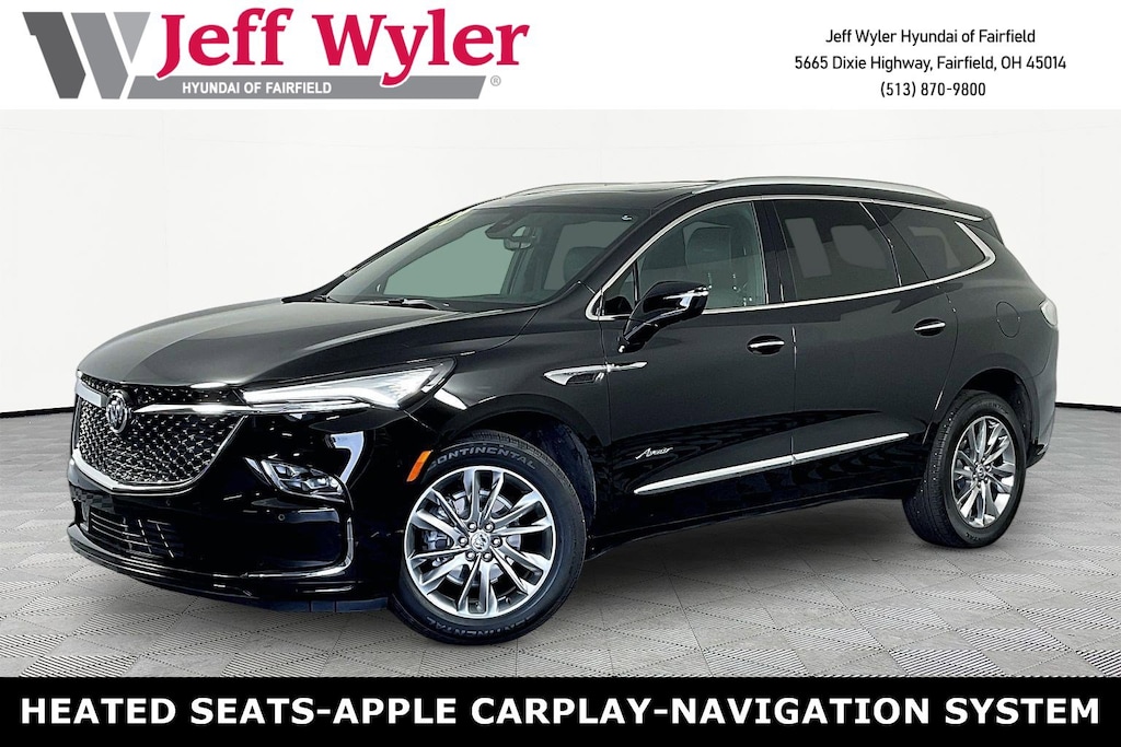 CARFAX One-Owner. Clean CARFAX. Jeff Wyler Hyundai of Fairfield is very proud to offer this fantastic 2023 Buick Enclave Avenir in Ebony Twilight Metallic. Well equipped with: 5000lbs Trailering Package (Heavy-Duty Cooling System, Hitch Guidance, and Hitch Guidance w/Hitch View), Avenir Technology Package (Chassis Continuously Variable Real Time Damping, Enhanced Avenir Design Headlamps, and Premium Ride Suspension), Memory Package, Preferred Equipment Group 1SP (2nd Row Heated Outboard Seats and Front & Rear Park Assist), AWD, Android Auto, Apple CarPlay, CALL NOW FOR YOUR VIP APPOINTMENT 513-870-9800, FULLY SERVICED w/RECORDS, GUARANTEED FINANCING!! NO MATTER YOUR SITUATION WE CAN GET AN APPROVAL!!, THE #1 Volume dealer in the region! Come see why for yourself Today!!, WE PAY MORE FOR YOUR TRADE!!, 10 Speakers, 3.49 Axle Ratio, 3rd row seats: split-bench, 4-Wheel Disc Brakes, 6-Way Power Front Passenger Seat Adjuster, 7-Passenger Seating, 8-Way Power Driver Seat Adjuster, ABS brakes, Air Conditioning, Alloy wheels, AM/FM radio: SiriusXM with 360L, Auto High-beam Headlights, Auto tilt-away steering wheel, Auto-dimming door mirrors, Auto-dimming Rear-View mirror, Automatic temperature control, Bose Performance-Enhanced 10-Speaker System, Brake assist, Bumpers: body-color, Compass, Delay-off headlights, Driver 4-Way Power Lumbar Seat Adjuster, Driver door bin, Driver vanity mirror, Dual front impact airbags, Dual front side impact airbags, Electronic Stability Control, Emergency communication system: OnStar and Buick connected services capable, Exterior Parking Camera Rear, Four wheel independent suspension, Front anti-roll bar, Front Bucket Seats, Front Center Armrest, Front dual zone A/C, Front Passenger 4-Way Power Lumbar Seat Adjuster, Front reading lights, Fully automatic headlights, Garage door transmitter, Heads-Up Display, Heated door mirrors, Heated Driver & Front Passenger Seats, Heated front seats, Heated rear seats, Heated steering wheel, Illuminated entry, Leather steering wheel, Low tire pressure warning, Memory seat, Navigation System, Occupant sensing airbag, Outside temperature display, Overhead airbag, Overhead console, Panic alarm, Passenger door bin, Passenger vanity mirror, Perforated Leather-Appointed Seat Trim, Power door mirrors, Power driver seat, Power Liftgate, Power moonroof, Power passenger seat, Power steering, Power windows, Premium audio system: Buick Infotainment System, Radio data system, Radio: Buick Infotainment Sys AM/FM Stereo w/Nav, Rain sensing wipers, Rear air conditioning, Rear anti-roll bar, Rear reading lights, Rear window defroster, Rear window wiper, Remote keyless entry, Roof rack: rails only, Security system, SiriusXM w/360L, Speed control, Speed-sensing steering, Spoiler, Steering wheel memory, Steering wheel mounted audio controls, Tachometer, Telescoping steering wheel, Tilt steering wheel, Traction control, Trip computer, Turn signal indicator mirrors, Variably intermittent wipers, Ventilated Driver & Front Passenger Seats, Ventilated front seats, Voltmeter, Wheels: 20" w/Pearl Nickel Finish, and Wireless Apple CarPlay/Wireless Android Auto. TO CHECK ON THE AVAILABILITY OF THIS VEHICLE REACH OUT TO ONE OF OUR TEAM MEMBERS!! ALSO SHOP ONLINE AT https://www.jeffwylerhyundaioffairfield.com/ Proudly Serving: Cincinnati, Dayton, Columbus, Louisville, Lexington, Indianapolis, Hamilton, Florence, Alexandria, Beavercreek, Springdale, West Chester, Monroe, Fairfield, Kenwood, Newport and all of greater Cincinnati Ohio, Indiana, and Northern Kentucky. New Price!
