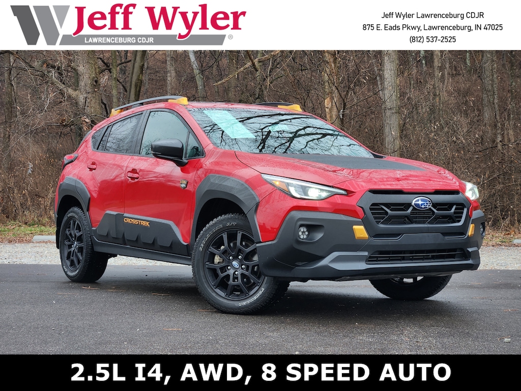 Jeff Wyler Chrysler Dodge Jeep of Lawrenceburg is pleased to offer this beautiful-looking 2024 Subaru Crosstrek Wilderness in Lithium Red Pearl. Harman/kardon Aud & Pwr Moonroof & Pwr Driver Seat (10-Way Power Driver's Seat, harman/kardon Surround Sound Speaker System, and Power Moonroof), Wilderness Package (Auto-Dimming Exterior Mirror w/Approach Light, Auto-Dimming Mirror w/Compass & HomeLink, LED Upgrade, Rear Bumper Cover - Wilderness, and Rear Seatback Protector), 4-Wheel Disc Brakes, 4.11 Axle Ratio, 6 Speakers, ABS brakes, Air Conditioning, Alloy wheels, AM/FM radio: SiriusXM, Anti-whiplash front head restraints, Auto High-beam Headlights, Automatic temperature control, Brake assist, Bumpers: body-color, Cargo Net, Driver door bin, Driver vanity mirror, Dual front impact airbags, Dual front side impact airbags, Electronic Stability Control, Emergency communication system: STARLINK Safety and Security (Subscription Required), Exterior Parking Camera Rear, Four wheel independent suspension, Front anti-roll bar, Front Bucket Seats, Front Center Armrest, Front dual zone A/C, Front fog lights, Front reading lights, Fully automatic headlights, Heated door mirrors, Heated Front Bucket Seats, Heated front seats, Illuminated entry, Knee airbag, Leather Shift Knob, Low tire pressure warning, Occupant sensing airbag, Outside temperature display, Overhead airbag, Overhead console, Panic alarm, Passenger door bin, Passenger vanity mirror, Power door mirrors, Power steering, Power windows, Radio data system, Radio: Subaru STARLINK 11.6" Multimedia Plus Sys, Rear anti-roll bar, Rear seat center armrest, Rear window defroster, Rear window wiper, Remote keyless entry, Security system, Speed control, Speed-sensing steering, Splash Guards - Wilderness, Split folding rear seat, Spoiler, STARLINK/Apple CarPlay/Android Auto, Steering wheel mounted audio controls, Tachometer, Telescoping steering wheel, Tilt steering wheel, Traction control, Trip computer, Turn signal indicator mirrors, Variably intermittent wipers, Wheels: 17" x 7.0J Matte Black Aluminum Alloy, and Wilderness StarTex Upholstery Our PRE-OWNED vehicles are put through a rigorous 167- POINT QUALITY ASSURANCE INSPECTION along with an average amount of over $1,400.00 SPENT to recondition each vehicle so we can be sure to deliver you the highest quality vehicle like you deserve! ***ONLINE PRICE DOES NOT INCLUDE WYLER FAMILY FIRST PACKAGE*** Stop by 4136 Shelbyville Road to see for yourself, or give us a call @ 502-897-3151 to schedule your test drive! Ask about available certifications.