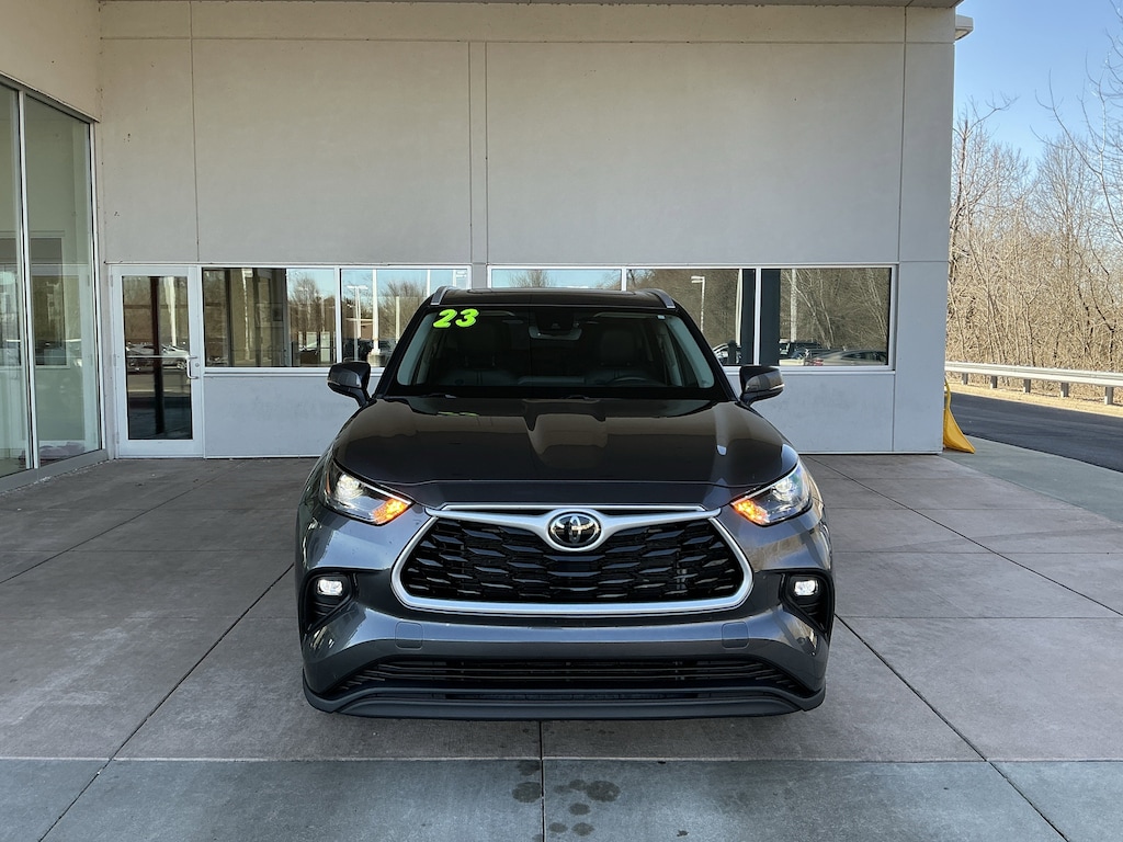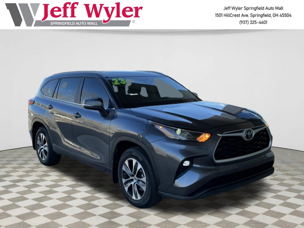Jeff Wyler Springfield Auto Mall is proud to offer this superb 2023 Toyota Highlander XLE in Gray. Well equipped with: ABS brakes, Active Cruise Control, Alloy wheels, Electronic Stability Control, Front dual zone A/C, Heated door mirrors, Heated Front Bucket Seats, Heated front seats, Illuminated entry, Low tire pressure warning, Power Liftgate, Power moonroof, Remote keyless entry, Traction control, 3.329 Axle Ratio, 3rd row seats: split-bench, 4-Wheel Disc Brakes, 6 Speakers, Air Conditioning, AM/FM radio: SiriusXM, Apple CarPlay/Android Auto, Auto High-beam Headlights, Auto-dimming Rear-View mirror, Automatic temperature control, Brake assist, Bumpers: body-color, Delay-off headlights, Driver door bin, Driver vanity mirror, Dual front impact airbags, Dual front side impact airbags, Emergency communication system: Safety Connect (up to 10-year trial subscription), Exterior Parking Camera Rear, Four wheel independent suspension, Front anti-roll bar, Front Bucket Seats, Front Center Armrest, Front fog lights, Front reading lights, Fully automatic headlights, Garage door transmitter: HomeLink, Knee airbag, Leather Shift Knob, Leather steering wheel, Occupant sensing airbag, Outside temperature display, Overhead airbag, Overhead console, Panic alarm, Passenger door bin, Passenger vanity mirror, Power door mirrors, Power driver seat, Power passenger seat, Power steering, Power windows, Radio: 8" Toyota Audio Multimedia, Rear air conditioning, Rear anti-roll bar, Rear reading lights, Rear window defroster, Rear window wiper, Reclining 3rd row seat, Roof rack: rails only, Security system, SofTex Seat Trim, Speed control, Speed-sensing steering, Split folding rear seat, Spoiler, Steering wheel mounted audio controls, Tachometer, Telescoping steering wheel, Tilt steering wheel, Trip computer, Turn signal indicator mirrors, Variably intermittent wipers, and Wheels: 18" Machined-Finish Alloy. Ask about available certifications. Used vehicles 10 years of age or newer with less than 100,000 miles are eligible for the Wyler Assurance Program, but eligible vehicles must pass our reconditioning process and multi-point inspection. Provided the vehicle passes inspection, vehicles will be eligible for the 6 month/6,000 mile limited warranty. The 6 month/6,000 mile limited warranty is NOT available on AS-IS vehicles, wholesale vehicles, lease buyback/pass-thru vehicles or un-inspected vehicles. Note that this program can also apply to vehicles where the remaining factory coverage is less than 6 months or 6,000 miles. Please check the Federal Trade Commission (FTC) Buyers guide on the vehicle for full details as to whether or not warranty coverage may apply. Contact Dealer for additional details. The Wyler Assurance 6 month/6,000 Mile limited warranty ends 6 months from the date of the Retail Purchase Agreement (BUYERS ORDER) or when the vehicle's odometer registers 6,000 additional miles to the mileage listed on the BUYERS ORDER, whichever comes first. Your Deductible - The warranty holder on your contract pays the first $100 of each covered repair.