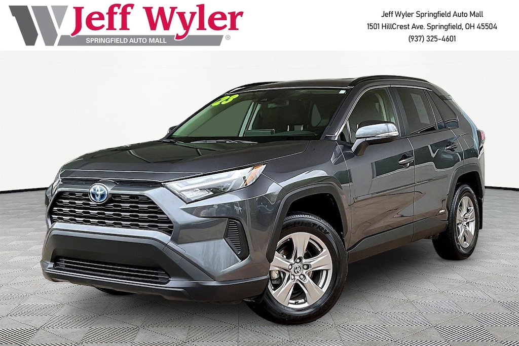 Jeff Wyler Springfield Auto Mall is excited to offer this outstanding 2023 Toyota RAV4 Hybrid XLE in Magnetic Gray Metallic. Well equipped with: Protection Package (TMS), 4-Wheel Disc Brakes, 6 Speakers, ABS brakes, Air Conditioning, All Weather Floor Liners & Cargo Tray (TMS), Alloy wheels, AM/FM radio: SiriusXM, Auto High-beam Headlights, Automatic temperature control, Axle Ratio: TBD, Brake assist, Bumpers: body-color, Delay-off headlights, Door Sill Protector (TMS), Driver door bin, Driver vanity mirror, Dual front impact airbags, Dual front side impact airbags, Electronic Stability Control, Emergency communication system: Safety Connect (1-year trial), Exterior Parking Camera Rear, Fabric Seat Trim, Four wheel independent suspension, Front anti-roll bar, Front Bucket Seats, Front Center Armrest, Front dual zone A/C, Front reading lights, Front Sport Seats, Fully automatic headlights, Heated door mirrors, Illuminated entry, Knee airbag, Lane Departure Warning System, Low tire pressure warning, Occupant sensing airbag, Outside temperature display, Overhead airbag, Overhead console, Paint Protection Film (TMS), Panic alarm, Passenger door bin, Passenger vanity mirror, Power door mirrors, Power driver seat, Power steering, Power windows, Radio data system, Radio: AM/FM/XM Audio System, Rear anti-roll bar, Rear seat center armrest, Rear window defroster, Rear window wiper, Remote keyless entry, Speed control, Speed-sensing steering, Split folding rear seat, Spoiler, Steering wheel mounted audio controls, Telescoping steering wheel, Tilt steering wheel, Traction control, Trip computer, Turn signal indicator mirrors, Variably intermittent wipers, and Wheels: 17" x 7.0J Silver Aluminum Alloy. Ask about available certifications. Used vehicles 10 years of age or newer with less than 100,000 miles are eligible for the Wyler Assurance Program, but eligible vehicles must pass our reconditioning process and multi-point inspection. Provided the vehicle passes inspection, vehicles will be eligible for the 6 month/6,000 mile limited warranty. The 6 month/6,000 mile limited warranty is NOT available on AS-IS vehicles, wholesale vehicles, lease buyback/pass-thru vehicles or un-inspected vehicles. Note that this program can also apply to vehicles where the remaining factory coverage is less than 6 months or 6,000 miles. Please check the Federal Trade Commission (FTC) Buyers guide on the vehicle for full details as to whether or not warranty coverage may apply. Contact Dealer for additional details. The Wyler Assurance 6 month/6,000 Mile limited warranty ends 6 months from the date of the Retail Purchase Agreement (BUYERS ORDER) or when the vehicle's odometer registers 6,000 additional miles to the mileage listed on the BUYERS ORDER, whichever comes first. Your Deductible - The warranty holder on your contract pays the first $100 of each covered repair.